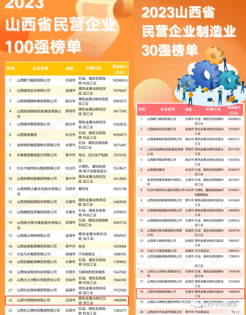 10月19日,2023山西省民營企業100強發布,中陽鋼鐵榜上有名。