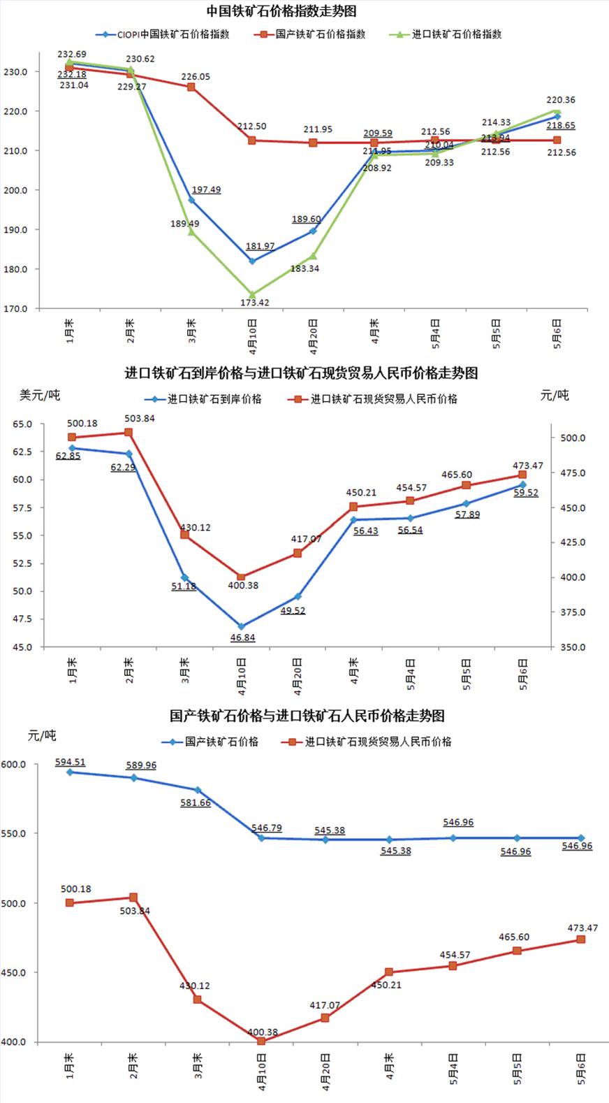 5月6日,現貨貿易進口鐵礦石62%品位干基粉礦人民幣含稅價格為473.47元/噸,環比每噸上升7.87元,升幅為1.69%,當月平均價格為464.55元/噸。